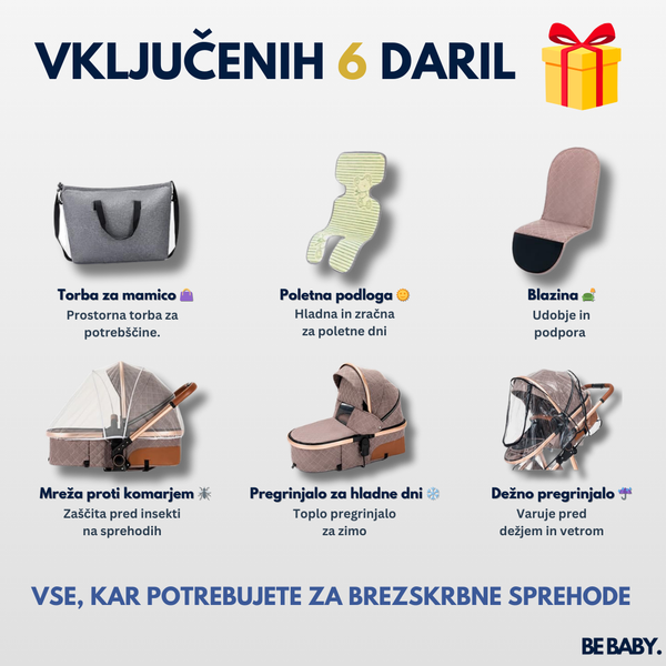 Ob nakupu prejmete brezplačno dežno pregrinjalo, mrežo proti mrčesu, torbo za mamice in poletno podlogo - vse za izboljšanje vaše izkušnje.
