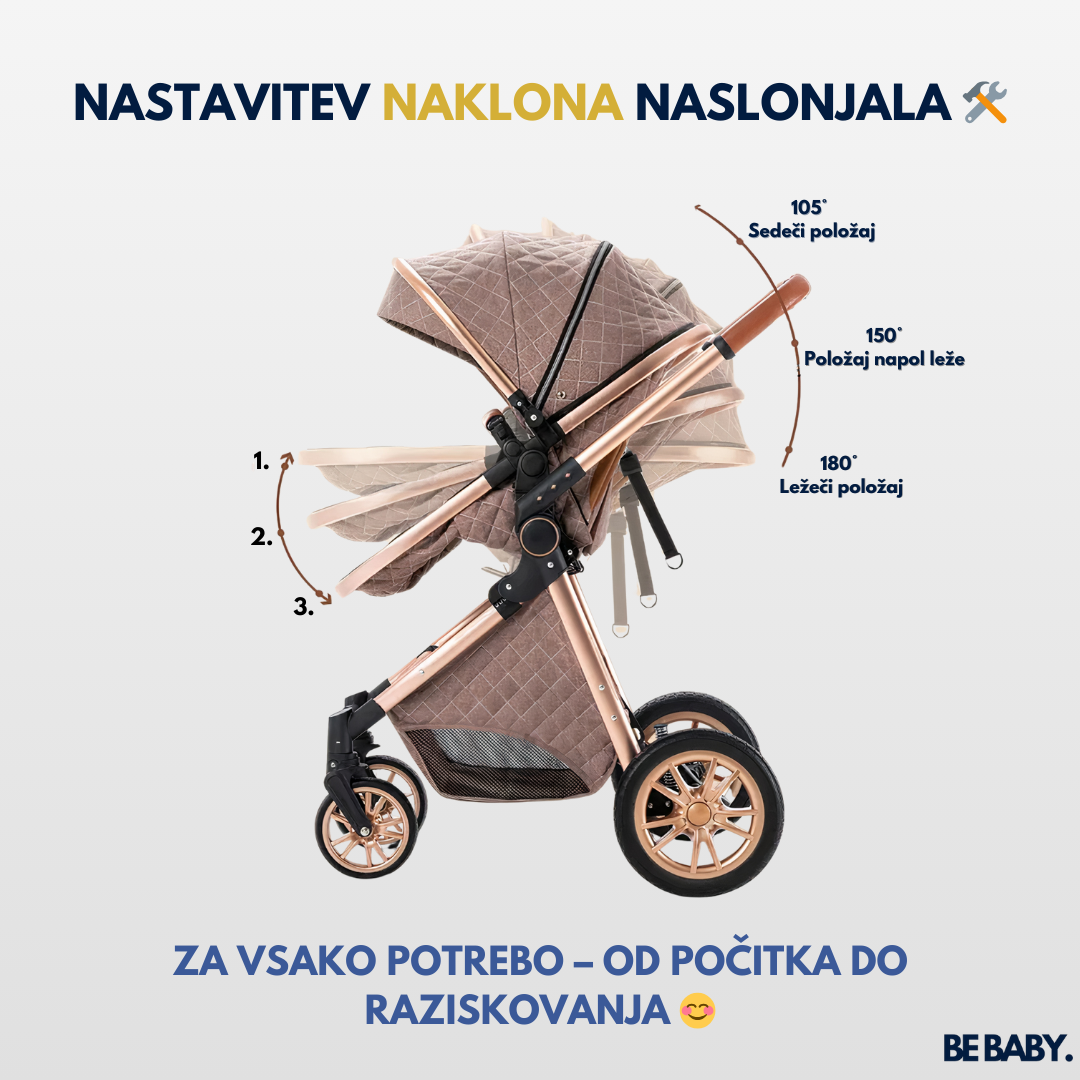 Njegova prilagodljiva zasnova omogoča enostavno nastavitev v različne položaje, od sedečega do ležečega, s čimer zagotavlja optimalno udobje za vašega otroka. Preprosta pretvorba v sedež omogoča nemoten prehod med sprehodi in vožnjo z avtomobilom.