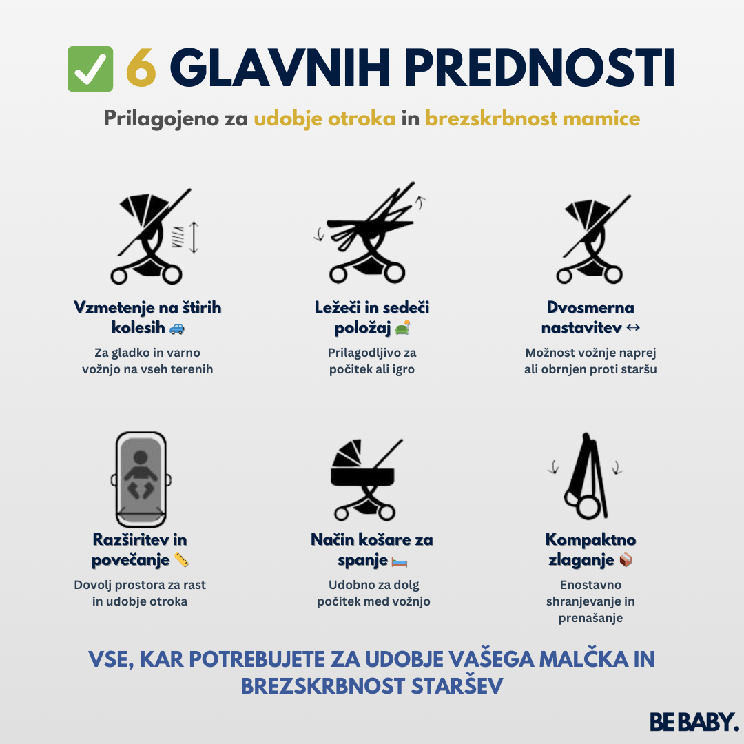 Izstopa zaradi svoje vsestranskosti in cene - združuje košaro, voziček in avtosedež v enem elegantnem dizajnu. Ponuja tudi vrhunsko udobje, stil in varnost.