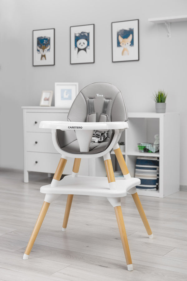 Tuva je visok stolček, ki združuje edinstven skandinavski slog s funkcionalnostjo. Zahvaljujoč preprostemu dizajnu se lahko hitro prilagodi potrebam otroka. Z nekaj premiki (brez odstranjevanja nog) se spremeni iz visokega stolčka v stilski komplet stola in mize.