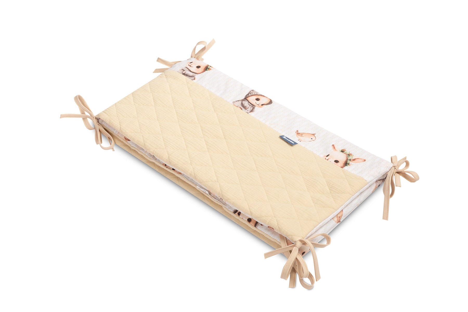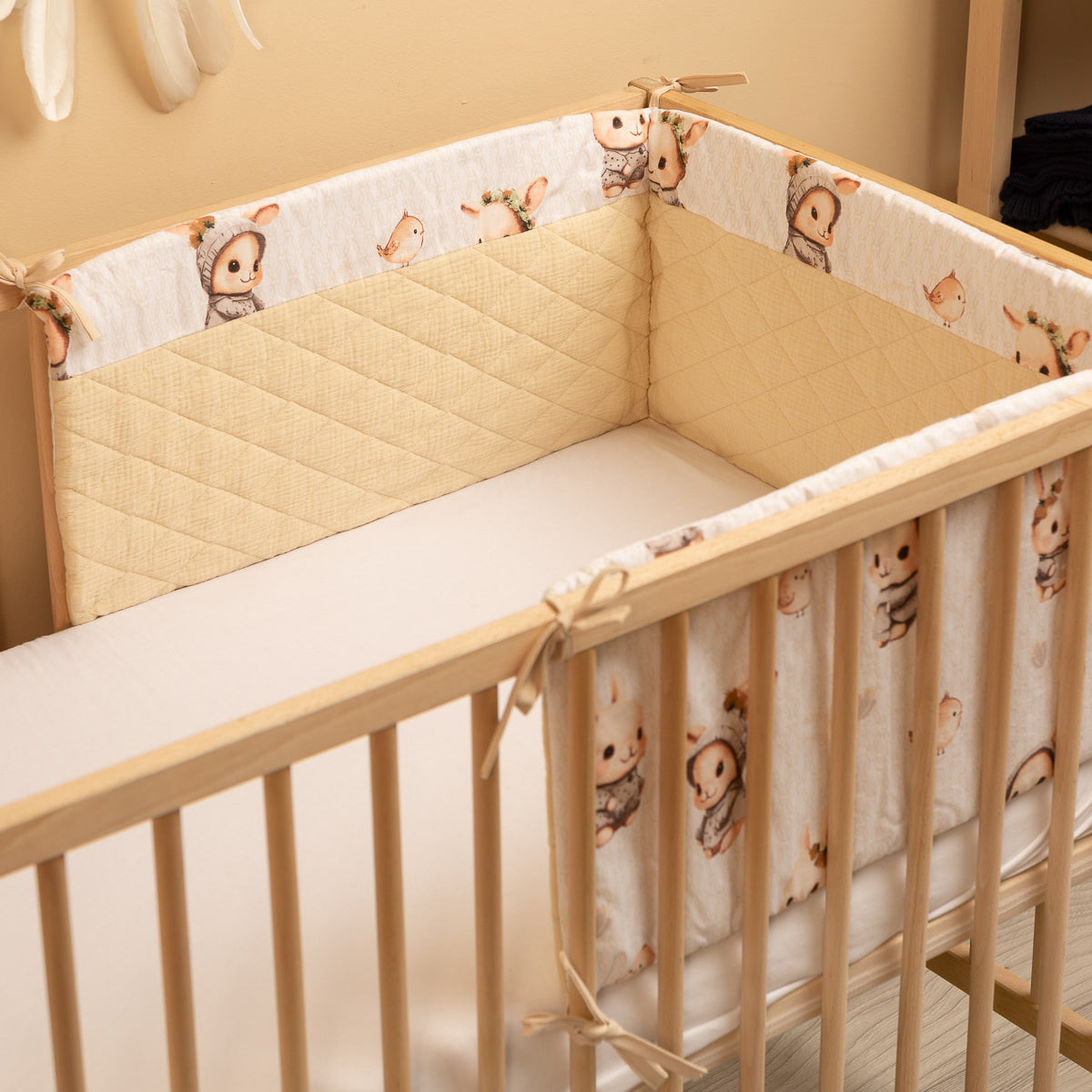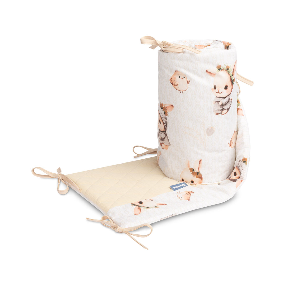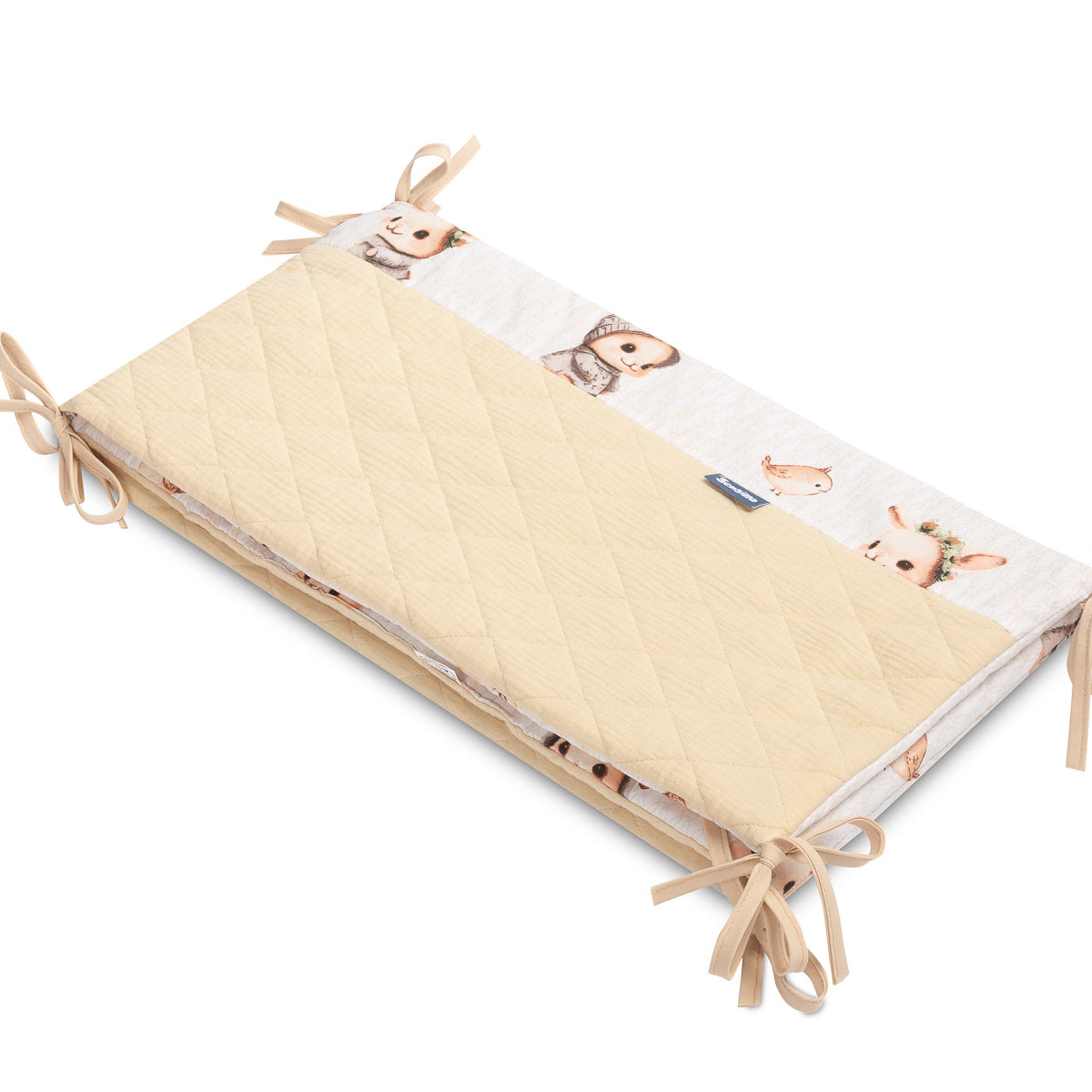 ZaŔčitna obroba za posteljico se prilega vsaki standardni otroŔki posteljici. Obroba je narejena iz mehkega tiskanega bombaža in prijetnega muslina na otip. Polnilo iz poliestra bo zaŔčitilo dojenčka pred poŔkodbami med gibanjem po posteljici. Obroba ostane na svojem mestu zaradi trakov, s katerimi se pritrdi na prečke posteljice. Namenjena je za posteljico z dimenzijami 120x60 cm. Obroba bo odličen dodatek k otroŔki opremi.