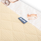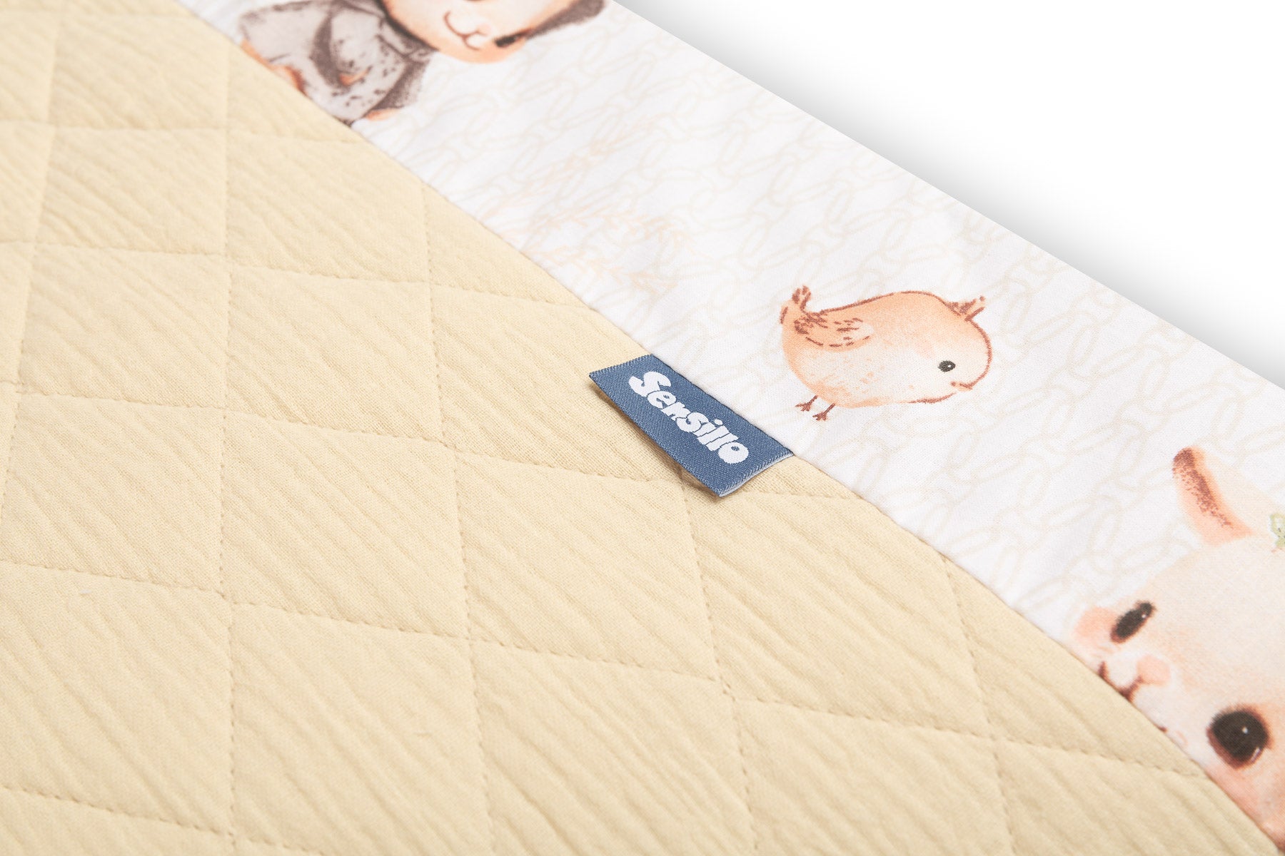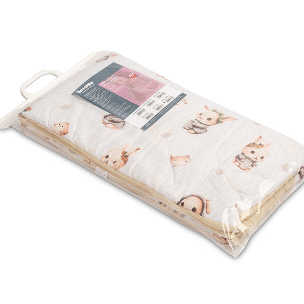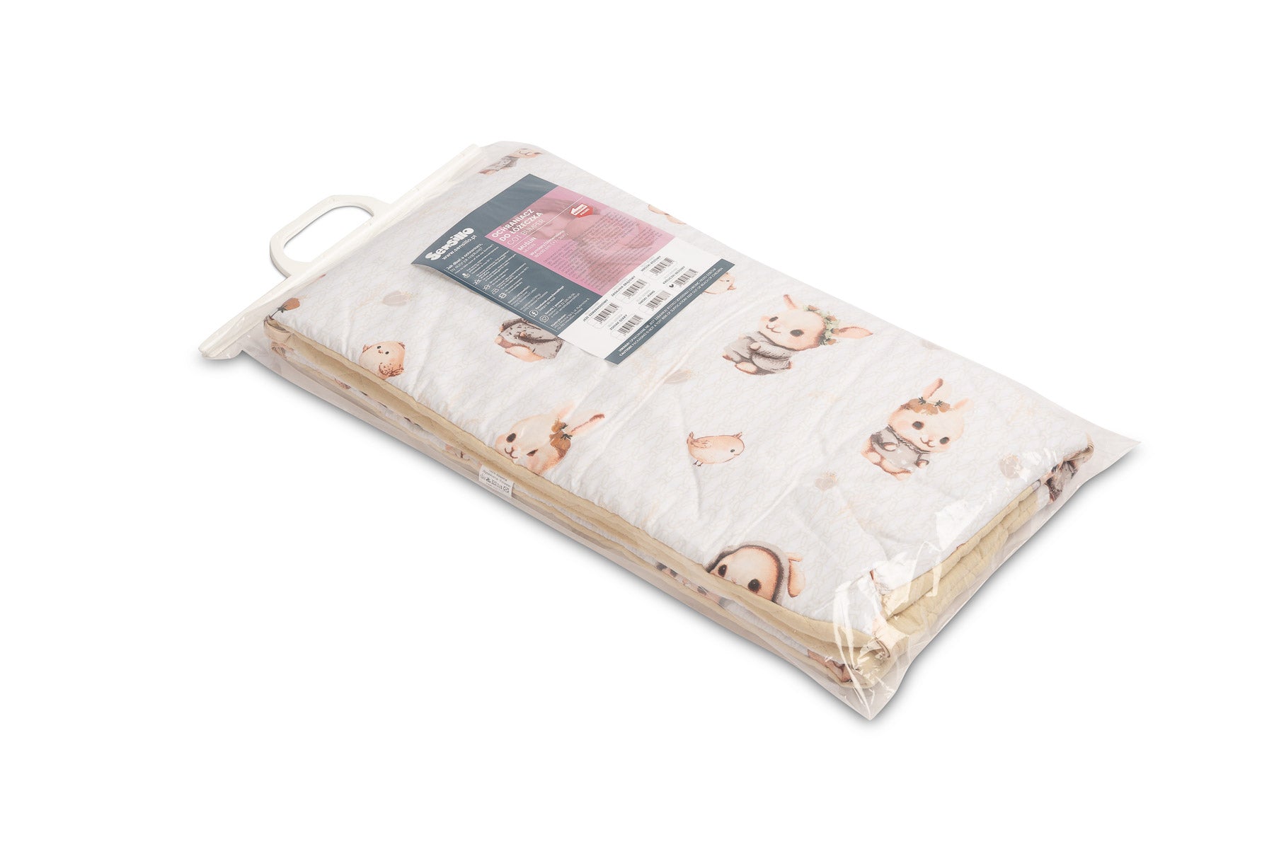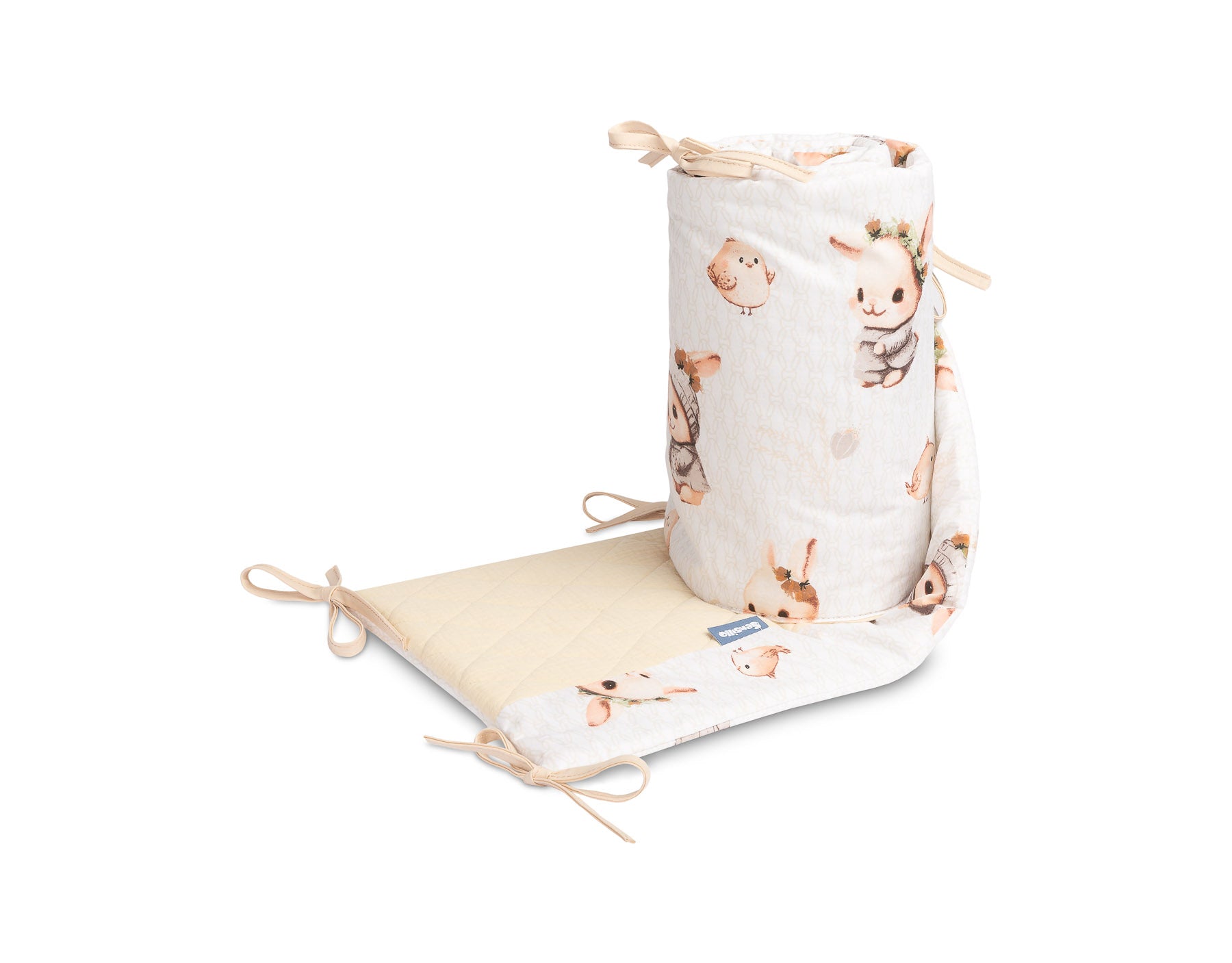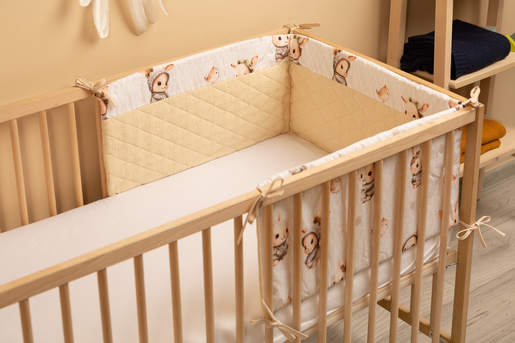 ZaŔčitna obroba za posteljico se prilega vsaki standardni otroŔki posteljici. Obroba je narejena iz mehkega tiskanega bombaža in prijetnega muslina na otip. Polnilo iz poliestra bo zaŔčitilo dojenčka pred poŔkodbami med gibanjem po posteljici. Obroba ostane na svojem mestu zaradi trakov, s katerimi se pritrdi na prečke posteljice. Namenjena je za posteljico z dimenzijami 120x60 cm. Obroba bo odličen dodatek k otroŔki opremi.